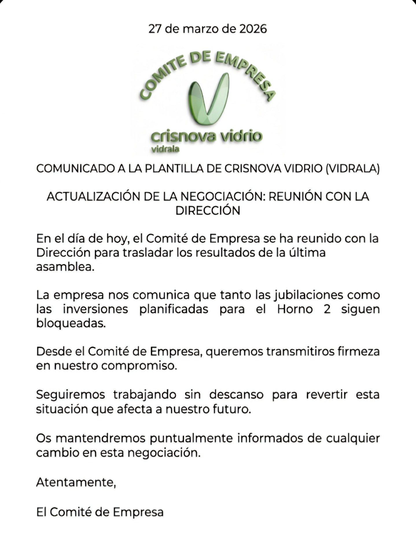 COMUNICADO DEL COMITÉ DE EMPRESA A LA PLANTILLA DESPUÉS DE LA REUNIÓN MANTENIDA CON LA DIRECCIÓN DE LA EMPRESA Y TRATAR LOS DATOS DE LA ASAMBLEA EXTRAORDINARIA DEL 24 DE MARZO