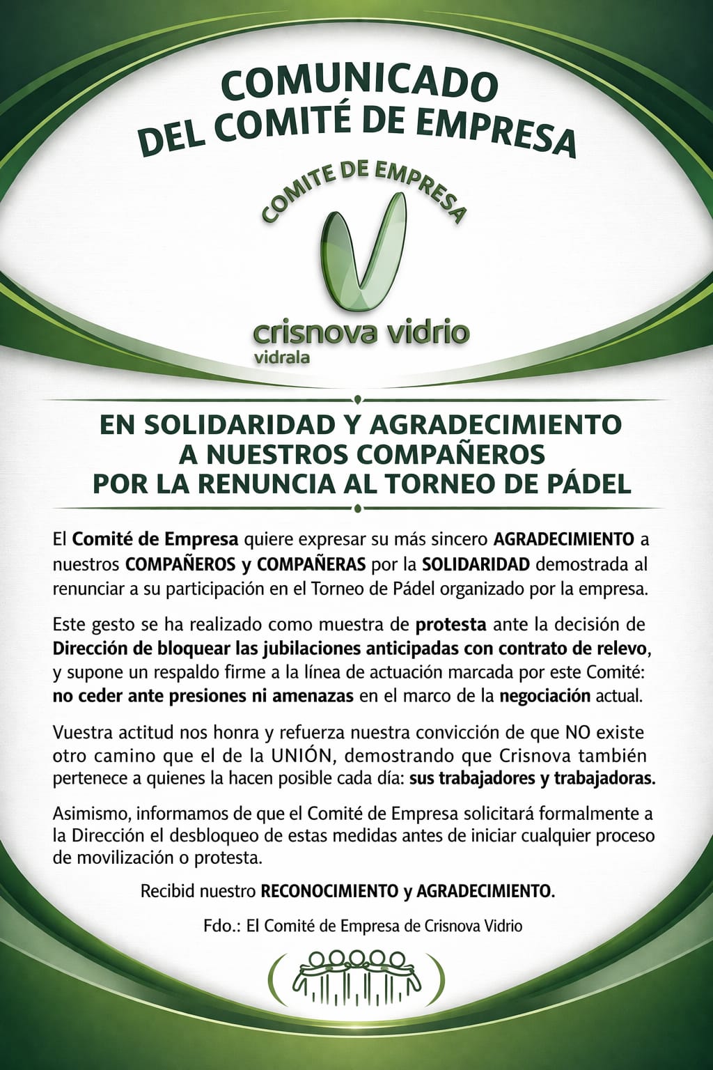 COMUNICADO DEL COMITÉ DE EMPRESA EN SOLIDARIDAD A NUESTROS COMPAÑEROS POR LA RENUNCIA AL TORNEO DE PADEL