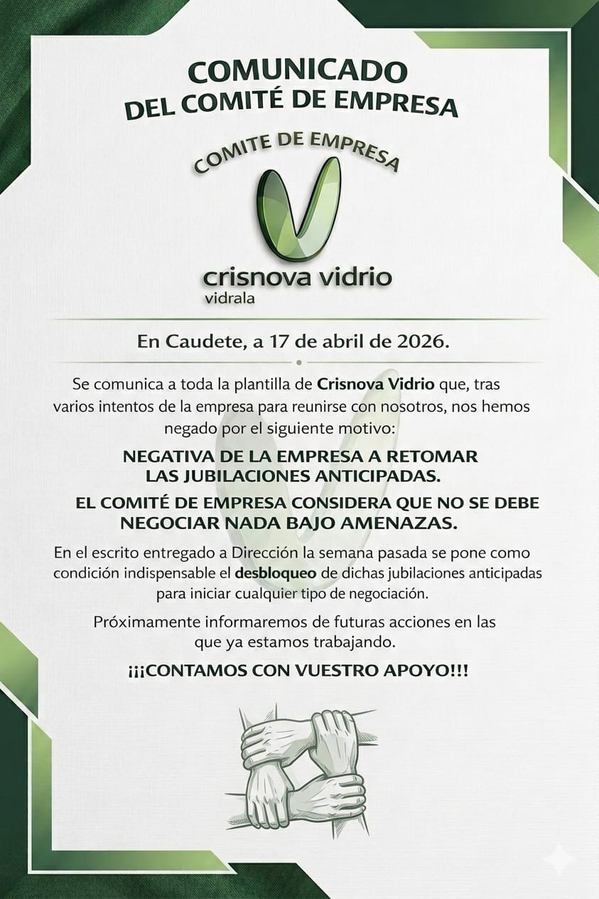 Como representantes de los trabajadores, nuestro objetivo es brindar información relevante y útil a nuestros compañeros de trabajo en la planta de Crisnova Vidrio S.A en Caudete (Albacete).